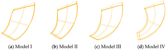 The head and efficiency indicators of twenty impeller models were comprehensively analyzed under different flow conditions, and four impeller models with different L/himp, L, and himp were selected to analyze these parameters’ effects on the RCP’s work and influx energy conversion mechanism. The selected models were Model 6, 8, 16, and 18, as shown in Figure 6, and named Model I, II, III, and IV, respectively. By comparing these models, analyzing constant himp, increasing L, and larger L/himp, it was found that the efficiency increased at both small flow conditions and design flow conditions, while the efficiency at large flow conditions tended to decrease significantly. When the L remained unchanged, and the himp decreased, the efficiency increased under small flow conditions but decreased under design flow conditions and large flow conditions.