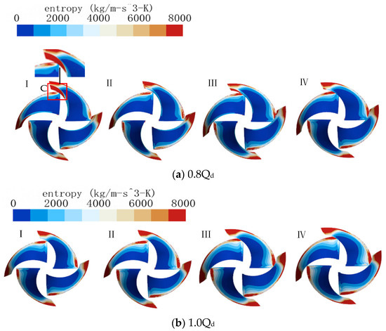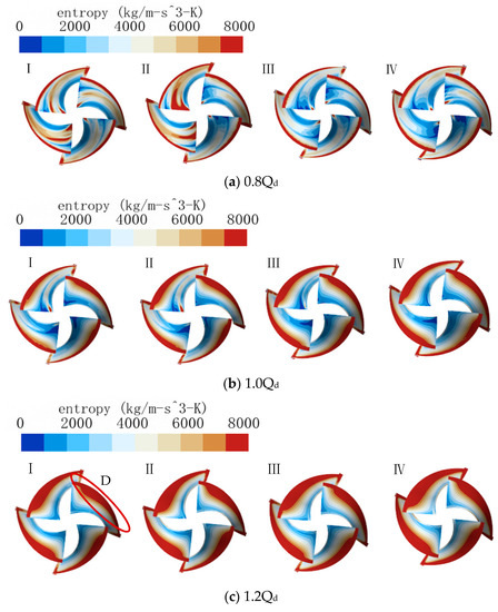 When the flow rate changes from 0.8Qd to 1.0Qd, the proportion of entropy production of Model I and II impellers remains unchanged, while the proportion of entropy production of Model III and IV impellers increases. Although the proportion of Model I and II remains unchanged according to Figure 12, the entropy generation rate of Model I impeller decreases, while that of the Model II impeller increases. This indicates that Model I is suitable for operation under 1.0Qd conditions, while Model II, with its reduced himp and narrower flow channel, is suitable for operation under low flow conditions.