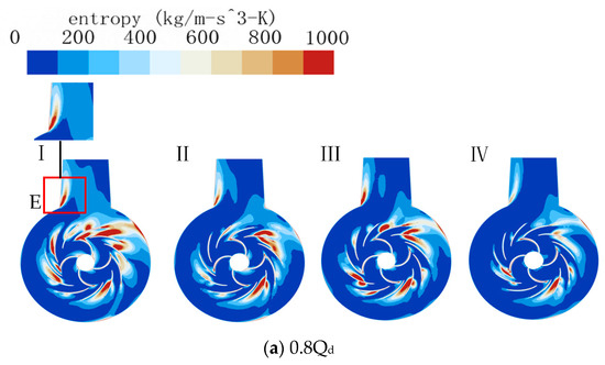 Figure 10 displays the entropy distribution of the axial section of the RCP, providing a visual representation of the internal hydraulic losses in the RCP. The area of the entropy generation rate distribution reflects the efficiency of the RCP, with larger areas indicating higher losses and lower efficiency. Figure 10 shows that hydraulic losses within the RCP are mainly located at the impeller outlet, guide vanes, inner flow channel and E zone.