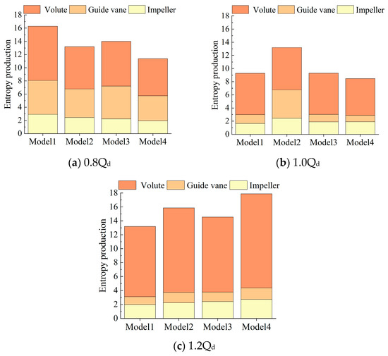 The guide vane entropy production of Model I, III, and IV decreases greatly, indicating that the impeller and guide vane coupling is better. The fluid entering the guide vane can better fit the linear flow of the guide vane. On the other hand, the guide vane entropy production of Model II increases because the short and narrow impeller blade shape leads to a higher velocity of fluid entering the guide vane, causing impact losses to the guide vane.