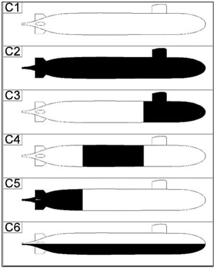 Of particular interest is the case where the lower half only of the submarine is fouled (Case 6). This represents the situation where cleaning has occurred on the exposed parts when the submarine is on the surface (Figure 2). Here it is assumed that the upper half of the submarine can be reached for cleaning; however, the lower half cannot. Or it may be that in a foreign port cleaning of the lower part of the hull is prohibited in order to reduce the transmission of invasive species [17]. This is a realistic scenario, as demonstrated by Figure 2, and numerous other photographs of submarines on the surface.