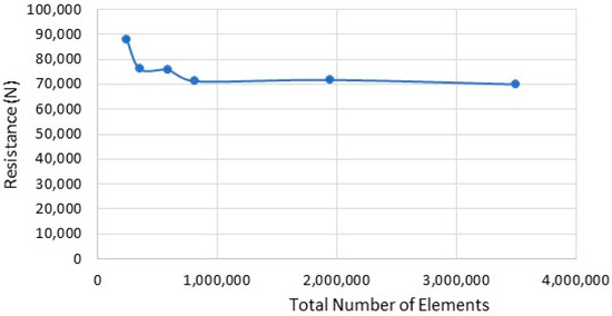 The parameter used was the total resistance. There are six simulations from small to large element determination in the range of 0 to 3,500,000 total elements. When the difference obtained with the different grid sizes is not more than 2%, the result is considered to be sufficiently independent of grid size, and hence the size of the grid required can be obtained.
