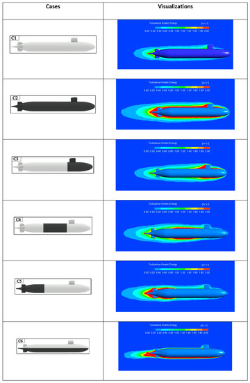 Note that although the fouled length and wetted surface for Cases 3–5 are not identical, they are considered sufficiently close that the large differences in resistance are not due to these small differences in either length or wetted surface for the three cases. Due to the geometry of the submarine, it is not possible to select regions where both the length and wetted surface area are the same.