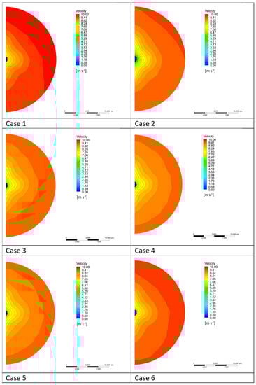The nominal wake distribution at the propeller plane for the submarine at a speed of 9.14 m/s is shown for the six cases tested in Figure 7. The magnitude of the axial velocity is indicated by the different colors, where the scales are the same for each case.