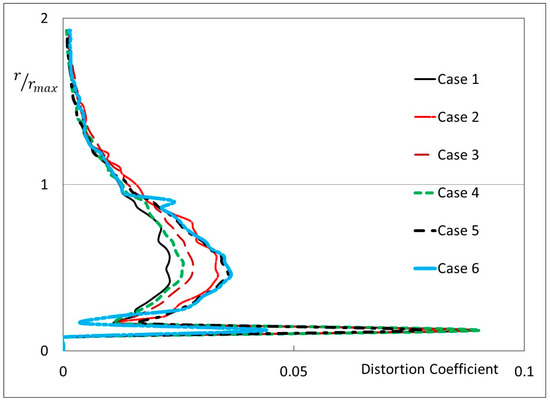 Case 6, with the lower half of the submarine fouled along its whole length, has values of the Distortion Coefficient close to those of the fully fouled case, other than for very small values of r/rmax. The reason for the lower values of the Distortion Coefficient for the smaller values of r/rmax is not clear and requires further investigation.