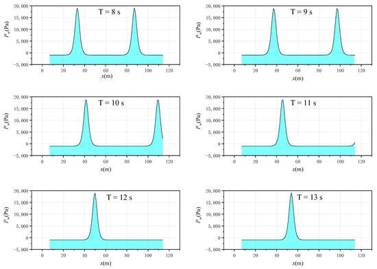 In this study, the approximate cnoidal wave pressure is calculated using MATLAB. As shown in Figure 2, it can be found that the distance between two crests is about 53 m when the wave period is 8 s. Meanwhile, the distance between two crests arrives at 89 m when the wave period is 13 s. The distance between two crests increases as the wave period increases. From Figure 2 it can also be seen that the shape of troughs becomes longer and flatter, while the shape of the crests become more convex when the wave period T increases from 8 s to 13 s.