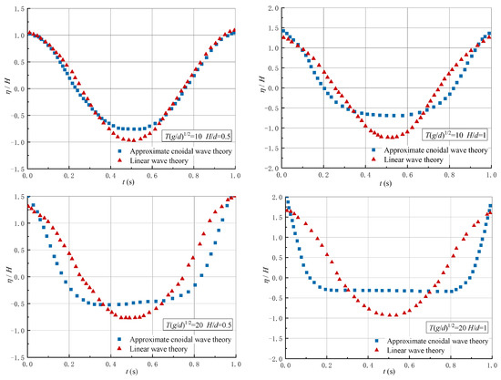 The comparison between the wave process curve, calculated with the theory of the linear wave, and the approximation cnoidal wave is shown in Figure 3. There is little difference between the results of the linear wave and the approximation cnoidal wave when the values of and are lower. However, when the values of and are large, there are significant differences in the wave surface process lines between the two theories, and the nonlinearity of the original results is more obvious. Due to the offshore waves having strong nonlinear characteristics, it is necessary to adopt nonlinear wave theories such as cnoidal wave.