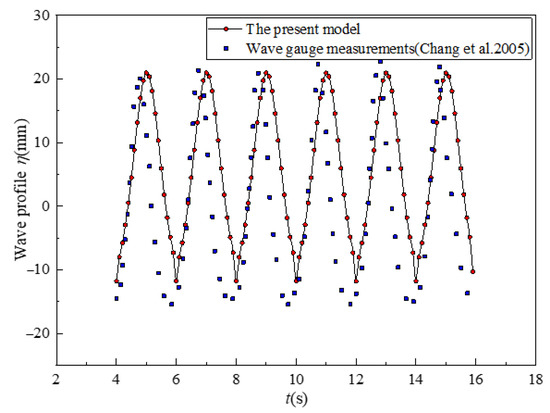 First, to check the approximate cnoidal wave theory, the free surface profile (the results were calculated according to Equation (7)) is compared with the experimental data of Chang et al. [20] in Figure 4. The cnoidal wave conditions for laboratory experiments are as follows: the wave period T is 2.0 s; the wave height H is 3.6 cm; the water depth d is 24.0 cm; the wavelength L is 2.97 m. The free surface elevation of the cnoidal waves is measured by using a wave gauge located at x = 4.8 m (x is the location of the wavenumber at rest) from the location of the wave-maker. As shown in Figure 4, although there are some differences between the existing results and the experimental data, the general trend is consistent.
