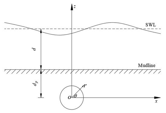 where ∇2 is the two-dimensional Laplace operator; p is pore water pressure; γw is the weight density of the seawater; is the coefficient of permeability; is porosity; Kw is the bulk modulus of water (Kw = 2.18 × 109 Pa); G is the shear modulus of soils; ν is Poisson’s ratio of soils; and z is the depth into the soils, as defined in Figure 5. is the buried depth to the center line of the pipe. r = (x2 + z2)1/2 is defined in Figure 5. x is the horizontal coordinate axis, as defined in Figure 5. R is the radius of the pipe.