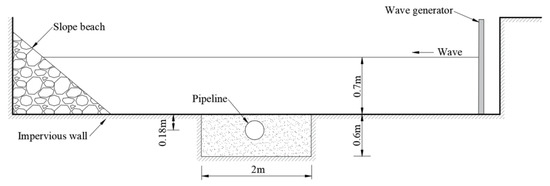 Sudhan et al. [23] conducted a flume test during their investigation of the distribution situation of seepage pressure of the seabed around buried pipelines under wave force. The model material used for the seabed was sand (d50 = 0.57 mm) and it was very uniform. The wave condition of the India East Sea coast was adopted in the test. The schematic of the test is shown in Figure 6. The values of the parameters used in the test are given in Table 1.