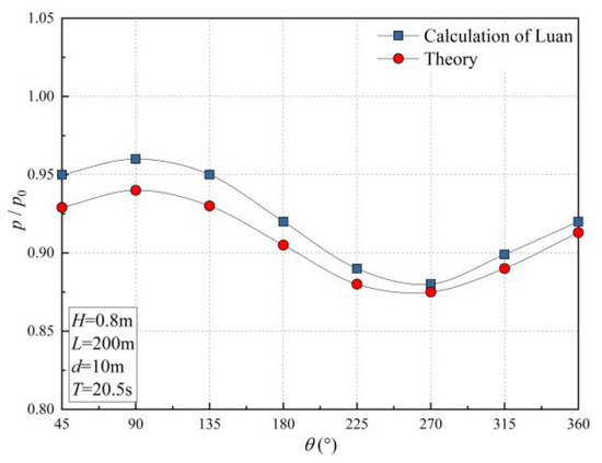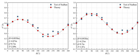 From Figure 7, it is clear that the pore water pressure around pipelines has a sinusoidal distribution; the largest dynamic pore pressure is at the top of the cylinder and the smallest is at the bottom. The theoretical values agree well with the test values.