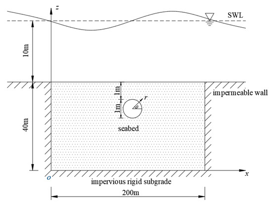 Luan et al. [22] analyzed the wave-induced dynamic response of the seabed around the pipeline by using the finite element method. Their calculation boundary conditions are shown in Figure 8. The calculation parameters are given in Table 2.