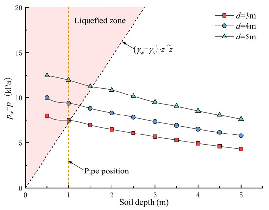 Because the diameter of the pipeline is 325 mm, and the buried depth is 0.66 m, the pipeline is located in the seabed at depths of about 1 m. From Figure 10 and Figure 11, it can be seen that the submerged weight of the soil particle is less than the seepage pressure for different return period waves and water depths, and most of the soil around the pipeline would be momentarily liquefied. The pipeline loses stability more easily in the research area, and attention should be paid to the operation of the pipeline over time.