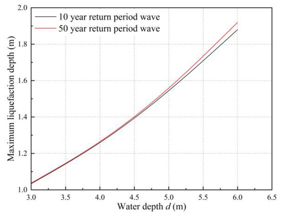 As can be seen from Figure 12, the maximum liquefaction depth under the 10-year return period wave is similar to that of the 50-year return period wave. This is because the elements of the wave tend to be consistent in different recurrence periods. From this figure, it is clear that the maximum liquefaction depth increased nonlinearly with the water depth.