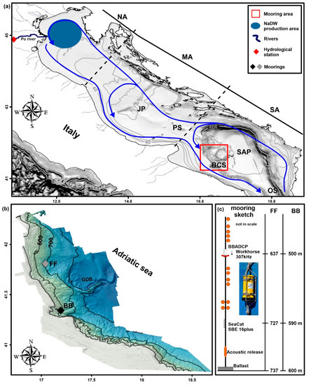Study Area. (a) The Adriatic Sea and its general circulation (from Lipizer et al., 2014). The basin is divided into sub-sectors: North Adriatic (NA), Middle Adriatic (MA), and South Adriatic (SA). JP indicates the Jabuka Pit, PS the Pelagosa Sill, SAP the South Adriatic Pit, OS the Otranto Strait, and BCS the Bari Canyon System. The red box indicates the sector where moorings were deployed. The blue area indicates the NAdDW production area in the northern sector and the red diamond is the position of the hydrological station on the Po’ river, which is represented by the bolded blue line (while other main rivers on the eastern Italian coast are thin blue lines); bathymetry of panel (a) and (b) is provided by EMODNET “https://portal.emodnet-bathymetry.eu/” (accessed on 29 June 2023). (b) Details of bathymetry of the South Adriatic margin where mooring BB and FF are located in the BCS and open slope, respectively. (c) Mooring structure schemes (not in scale).