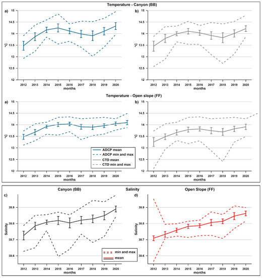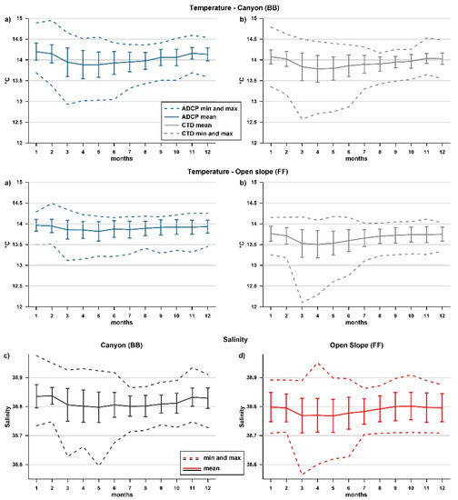 Upper panel: monthly average (continuous line) and standard deviation (bar) of temperature recorded by the (a) ADCP (100 mab—blue line) and (b) CTD (10 mab—grey line) probes at the two mooring sites; dashed lines indicate minimum and maximum values. Lower panel: monthly average (continuous line) and standard deviation (bar) of salinity recorded by the CTD probe (10 mab) at the (c) BB and (d) FF sites.
