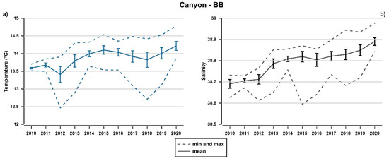 Temperature (a) and salinity (b) time series recorded at site BB. The records from 2010 to 2012 are extended with a dataset from previous research [15]. Dashed lines indicate the minimum and maximum value, while continuous lines represent the mean and vertical bars indicate standard deviation.