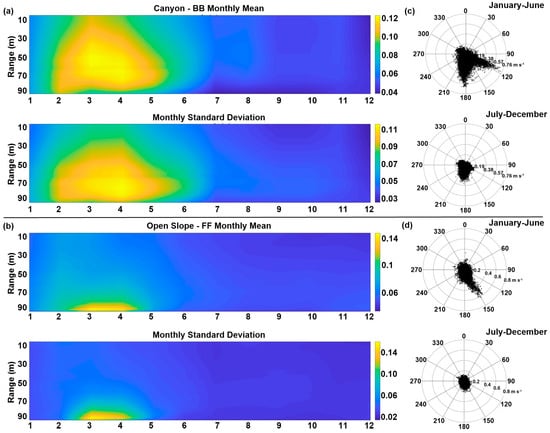 Monthly mean current speed and standard deviation of the current speed at the (a) canyon (BB) and (b) open slope site (FF). Panels (c,d) represent the polar plots of the currents in the bottom layer separated into two different month groups.