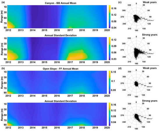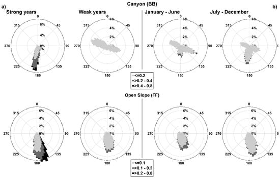 When events are grouped into “strong” and “weak” years (Figure 6c,d), the differences between the two hydrodynamic regimes become clear. Flows with velocities greater than 0.3 m s−1 in the direction of the canyon axis in BB and those with velocities greater than 0.2 m s−1 in the southeast direction in FF are completely absent in “weak” years.
