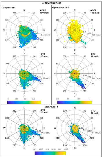 The characteristics of the water masses cascading down the slope (FF site) and down the canyon (BB site) are clearly highlighted by linking the flow velocity data to the thermohaline properties measured at the ADCP and CTD mooring depths, respectively. A clear overview of the dynamic processes is provided by in the polar diagrams in Figure 8, which show flow direction and velocity associated with the corresponding temperature (Figure 8a) and salinity (Figure 8b) data.