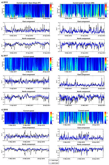 The conditions shown in Figure 10a–c illustrate the hydrodynamics during the cascading events. At both sites, the hydrodynamics are characterized by intermittent pulses that propagate along the water column in different ways. As observed during the 2012 short-term observations [41], the pulses occur more frequently at the FF site and are confined to a narrow layer near the bottom. In contrast, at the BB site, they have a longer period and cover a greater thickness of the water column. The northern and eastern components of the flow at BB have negative and positive values, respectively, during acceleration and differ little between the upper and lower layers. In contrast, the values of the components in FF are very weak in the upper layer, while sharp peaks occur in the lower layer, indicating the clear southeasterly motion of the flow.