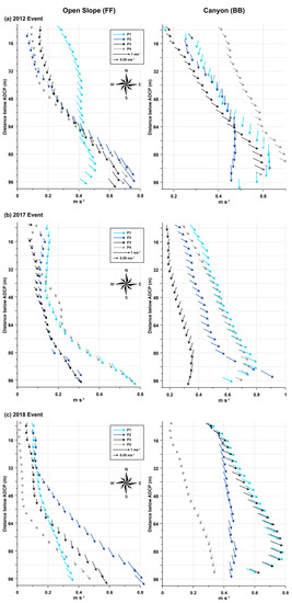 Profiles of current speed at the open slope (FF) (left) and canyon (BB) (right) extracted from the time series during the events in (a) 2012, (b) 2017, and (c) 2018. For each depth cell, the arrows indicate the intensity and orientation of currents. The geographical reference of vector orientation is indicated by the wind rose below the legend.