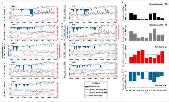 From the graphs in Figure 12b, it is clear that 2012 was a year of high heat loss combined with below-average river discharge. Similarly, in 2017 and 2018, both heat loss and lower river discharge were more pronounced; in particular, in 2018, the maximum density values at the FF station reached the highest values, while the values at the BB station were comparable to those of 2012. In 2013, heat loss was higher than average, but this condition was accompanied by river discharge close to average values. A hydrologic deficit can also be seen in 2016 and 2019, but net heat fluxes were very different in those years. In 2016, net heat flux loss was near zero, while net heat flux loss in 2019 was higher but lower than average. In 2014, 2015, and 2020, the density anomaly did not change significantly, and these years were characterized by high river run-off and below-average or near-average heat loss.