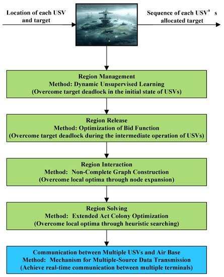 The structure of this paper follows a coherent outline. Firstly, it presents the overall idea and procedural framework, while highlighting the problem the paper aims to address. Subsequently, representative conventional methods for multi-USV target allocation are introduced, exposing their two specific limitations, thereby laying the groundwork for proposing improvement strategies. Next, a Region-Construction approach is proposed to tackle the identified limitations, encompassing four sub-solutions: region management, region release, region interaction, and region solving. Each sub-solution is described in a separate section, emphasizing their innovative processes and originality. Following this, a simulation platform is constructed to conduct experiments, including two categories of tests: one to evaluate the effectiveness of the proposed method in resolving the aforementioned limitations, and another to compare the specific performance of the proposed method with two traditional methods. Finally, a comprehensive analysis and summary are provided, discussing the proposed method and the experimental results.