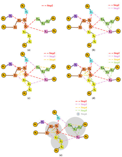 Figure 6a illustrates a local environment with three target points and two USVs . The three target points will be allocated to the two USVs following the MINISUM rule. Each USV estimates its travel cost by calculating the distances to the target points. In the first round, USV offers the lowest travel cost of for target point , a travel cost of 2 for , and a travel cost of for . Meanwhile, USV offers a lower travel cost of 1 for compared to . Consequently, target point is successfully allocated to USV .