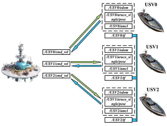 This target allocation system primarily includes five packages: allocation_common, allocation_gazebo, control_terminal, gazebo_description, and task_allocation. Task_allocation is the core of target allocation, while control_terminal is responsible for message publishing and updating the USV states within the Gazebo environment. Allocation_common, allocation_gazebo, and gazebo_description configure the relevant parameters and simulation environment for the target allocation process. The interaction of various nodes and topics after launching the system is shown in Figure 8.