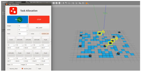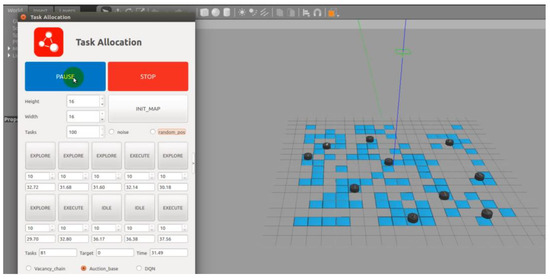The left side of Figure 7 displays the target allocation control terminal, which allows setting the number of participating USVs, the number of target points, and other relevant parameters. Upon initializing the map, the black discs on the right represent the mobile USVs in the simulation environment, while the blue regions represent the target points that the USVs need to reach and execute in an unknown environment.