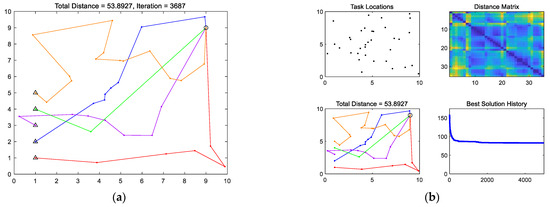 Assignment of 33 target points to 5 USVs based on the NCG M-TSP framework. (a) Final assignment results; (b) Target assignment related information and optimal solution iteration.