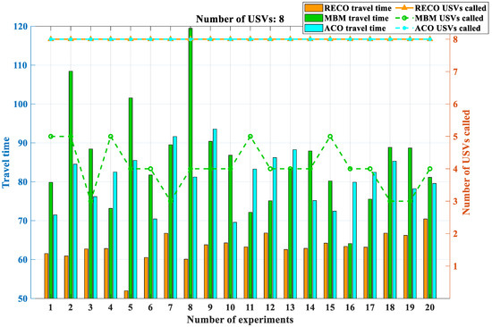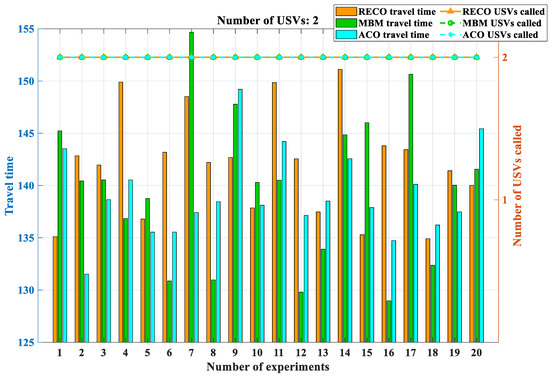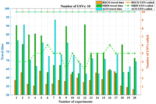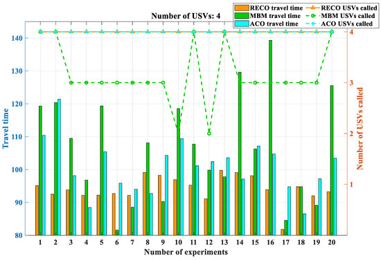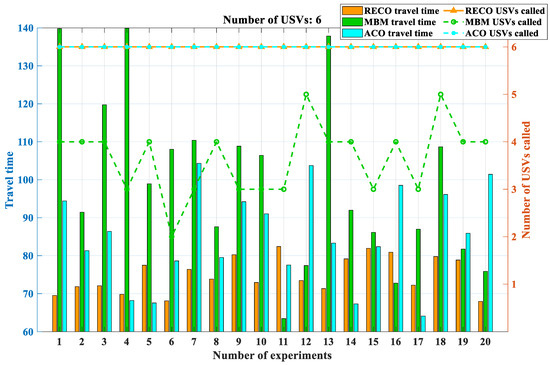 The analysis of the data presented in Figure 26, along with Table 3 and Table 4, provides valuable insights into the performance of different methods. Firstly, when the number of unmanned surface vessels (USVs) is relatively low, there appears to be no notable distinction in terms of algorithm execution time or the number of USVs initially deployed between the RECO, MBM, and ACO methods. This observation suggests that these methods perform similarly under such conditions.