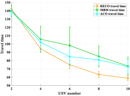 Error bar of USVs’ total travel time for the three methods.