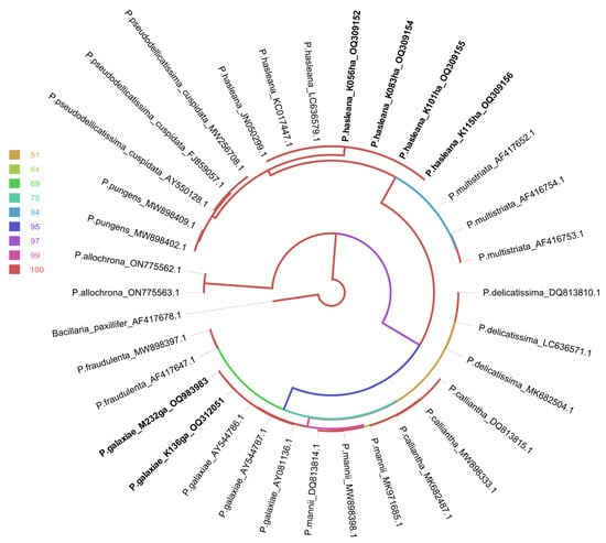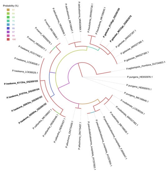 - Tamura, K.; Stecher, G.; Kumar, S. MEGA11: Molecular Evolutionary Genetics Analysis Version 11. Mol. Biol. Evol. 2021, 38, 3022–3027. [Google Scholar] [CrossRef] [PubMed]