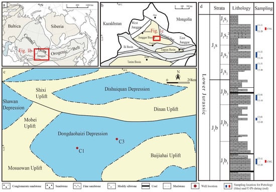 (a–c) Geological map of Eurosia Plate, Junggar Basin, and Dongdaohaizi area, respectively. (d) Chronostratigraphy and lithology section of Lower Jurassic in Dongdaohaizi Depression. Abbreviations: J1b = Lower Jurassic Badaowan Formation, J1s = Lower Jurassic Sangonghe Formation.