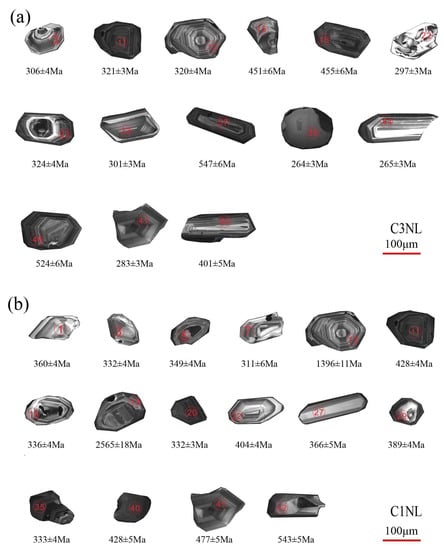 Samples C1NL (~2 kg) and C3NL (~2.5 kg) were collected, and samples with relatively uniform color and lithology were selected. These samples were sent to Chengxin Geological Services Company in Langfang, Hebei for zircon separation to obtain sufficient zircons for testing and analysis. The zircons were made into targets at Beijing Zirconia Navigation Technology Co., Ltd., Beijing, China. The zircon samples were then subjected to transmitted and reflected light and Cathodoluminescence (CL) photography to observe their structure. The choice of CL images for the analysis is the Chromal CL 2 cathodoluminescence probe, which is configured on the JEOL JSM-6510A scanning electron microscope. The analysis conditions are as follows: acceleration voltage of 10 kV, beam current of SS65, and a working distance of 14 mm. These experiments were worked out at the Experimental Center of the School of Earth Sciences, Yangtze University.