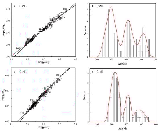 The zircon morphology of the sandstone from the Badaowan Formation is mainly short columnar and irregular grains, with a grain size ranging mostly from 70 to 180 μm and an average size of 126 μm. Most of the zircons are angular, but some are well-rounded, suggesting that they may have been transported over a long distance. Cathodoluminescence (CL) images of the zircons from the Badaowan Formation reveal that most zircons have weak luminescence and typical oscillatory zoning features, indicating that they are mainly magmatic zircons (Figure 3a). The Th/U values of the zircons are generally greater than 0.4, with a range of 0.4–1.6. Zircons with a Th/U ratio greater than 0.4 accounts for approximately 90% of the zircons (Table S2), reflecting their magmatic origin. However, a few zircons exhibit strong cathodoluminescence intensity without zoning or with weak or patchy zoning (Figure 3a), indicating that they are metamorphic zircons. A small number of zircons also have Th/U values less than 0.1, reflecting their metamorphic origin, while others have Th/U values between 0.1 and 0.4 (Table S2).