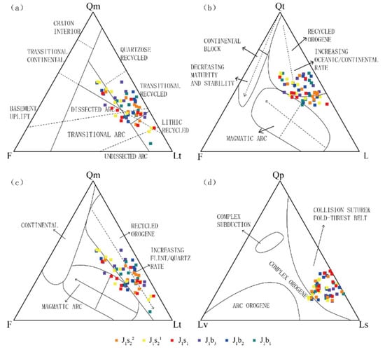 The (a) Qm-F-Lt, (b) Qt-F-L, (c) Qm-F-Lt and (d) Qp-Lv-Ls ternary plots of relative proportions of framework-grain compositions for sandstones from Badaowan and Sangonghe Formations in Dongdaohaizi Depression. The data and abbreviations are shown in Table S1.