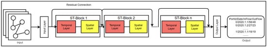 Firstly, this paper summarizes the existing general framework of spatiotemporal graphs, as shown in Figure 1. The combination of the temporal layer and the spatial layer is referred to as a “spatiotemporal block.” In the spatiotemporal block, the temporal layer captures the temporal patterns of historical traffic flow data for each port, while the spatial layer handles the relationships among port nodes across different time dimensions. The sequential arrangement of multiple spatiotemporal blocks forms a deep spatiotemporal graph neural network model.