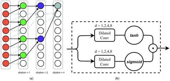 On the other hand, as a key to the success of recurrent neural networks, gating mechanisms preserve the non-linear capabilities while addressing the vanishing gradient problem, leading to better performance in tasks involving long-term dependencies. WaveNet [] incorporates gating activation structures into causal convolutions, proposing the WaveNet structure shown in Figure 4b. The formula can be represented as