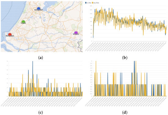 Fluctuation in ship flow between different ports in the Netherlands. (a) The locations of four closely located ports within the Netherlands; (b) Rotterdam Port 2019 daily inbound and outbound traffic curve; (c) Arnhem Port traffic curve; (d) Leiden Port traffic curve.