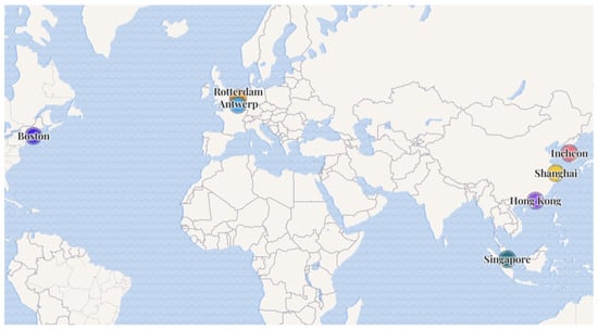 The geographical coordinates and location information of the seven central ports are displayed in Figure 7. The comprehensive data attributes of the port cluster network scene, centered around these seven ports, are recorded in Table 1.