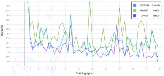 In the experiment, the baseline models were divided into two major categories, spatiotemporal graph models and temporal models, based on whether they handled spatial features. RNN, AE [], Seq2Seq [], WaveNet [], and Transformer [] are classical temporal prediction methods that have proven effective in various domains, such as NLP and traffic prediction. STGCN [], AGCRN [], and the proposed model GAGW in this paper belong to spatiotemporal graph models. On the other hand, based on different time layer processing strategies, models can be further categorized into RNN-based prediction models led by RNN and DCRNN [], TCN models such as GWNET [] and STMGAT [], and self-attention-mechanism-based models such as STTN [].