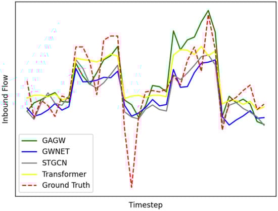 The training curves of the top-performing three spatiotemporal graph models in the traffic flow scenario centered around the Rotterdam Port cluster are shown in Figure 8. The proposed model in this paper achieves more accurate predictive performance by utilizing a multi-head attention mechanism similar to STTN and STMGAT in the graph convolutional layer. However, this improvement in accuracy comes at the expense of sacrificing some training speed, resulting in a convergence speed that is not state-of-the-art. As illustrated in Figure 9, our model’s traffic flow predictions exhibit better adherence to the actual flow variation patterns compared to other baseline models and demonstrate good fitting capability for significant flow fluctuation curves.