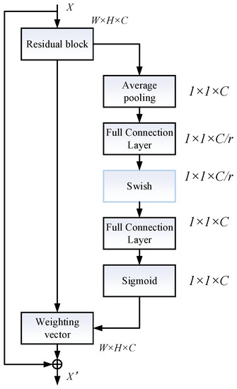 As shown in Figure 1, the SE module (SENet for short) mainly includes two operations: Squeeze and Excitation, which can be applied to any mapping; with the input and output . The SENet proposes a squeezing operation, namely Fsq (·) in Figure 1, which encodes the entire spatial feature on a channel into a global feature. The calculation formula is: