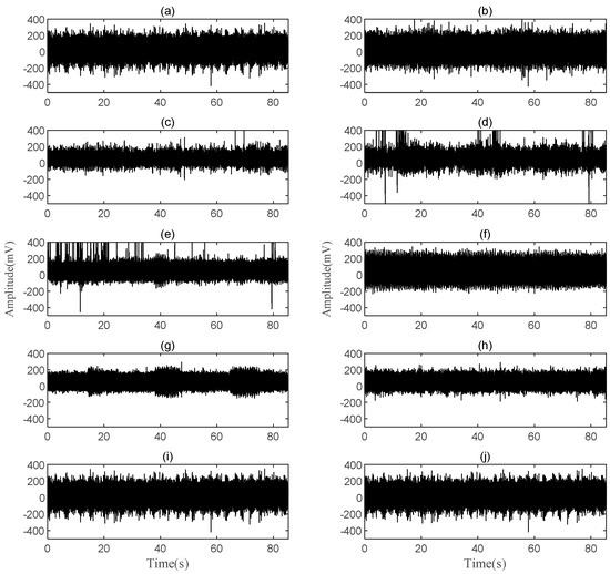 The ten vibration signals of motors: (a) end ring cracking 30 Hz; (b) end ring cracking 40 Hz; (c) broken rotor bar 30 Hz; (d) broken rotor bar 40 Hz; (e) health 30 Hz; (f) health 40 Hz; (g) turn-to-turn short circuit 30 Hz; (h) turn-to-turn short circuit 30 Hz; (i) bearing failure 30 Hz; (j) bearing failure 40 Hz.
