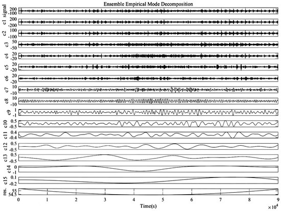To provide a detailed demonstration of the denoising method used in this study, this project first processed a set of motor vibration signals using the EEMD. The EEMD adaptively decomposed the signal into 15 Intrinsic Mode Functions (IMFs), as depicted in Figure 6.