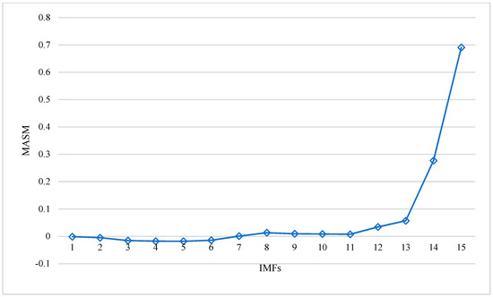 Secondly, to effectively extract fault feature information, the mean of the standardized accumulated modes (MSAM) was employed to classify the decomposed IMFs into two categories: low-frequency IMFs and high-frequency IMFs. In accordance with Equation (2), a threshold of 12 was utilized to differentiate the high-frequency IMFs from the low-frequency IMFs. This differentiation is visually illustrated in Figure 7.