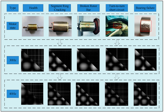 To comprehensively capture the health status information of the data, the Gramian Angle Field (GAF) diagram was employed. The GAF diagram was particularly advantageous for describing two-dimensional time-domain data, enabling a more comprehensive representation of the data’s health condition. In the experiment, the one-dimensional vibration signal and current signal obtained from the sensor served as inputs to the network. These signals were transformed into a two-dimensional bimodal fused Gramian Angle Field map. Taking the data from the motor in this experiment as an example, the health characteristics, as well as the characteristics of rotor bar breakage, inter-turn short circuit, segment ring cracking, and bearing failure obtained from the sensors, are depicted in Figure 9.